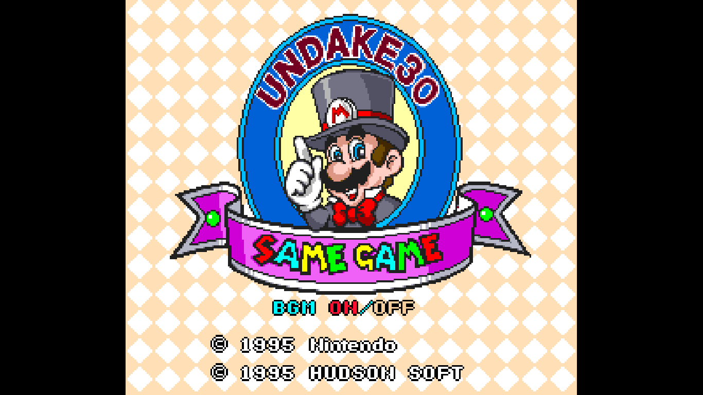 UNDAKE30 Same Game Daisakusen (UNDAKE30 鮫亀大作戦, lit. UNDAKE 30 Shark-Turtle Battle) is a puzzle game serie which could be controlled with a standard joypad or the Super Famicom Mouse and was similar to the card game Monte Carlo. The game centers around a large playing field composed of a random arrangement of symbols : frog,bell, seven, blue ball, and cherry (original and UraGame version only) Mario Heads, Coins, Yoshi Eggs, Fire Flowers, and Super Mushrooms (Mario version only). If two or more icons are connected, the player can move the cursor and click to make all the connected icons disappear. Now the icons above fall down and the player can clear even more icons. Also, there is an undo move that allows the Player to take back the last move, and move back as far as wanted. Once the entire grid is clear, the game ends. The game series was developed by Hudson Soft.